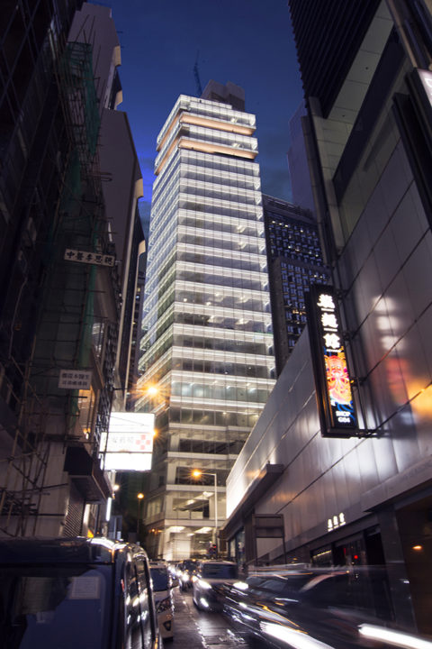 煌びやかな光をまとったハイブランドショップや金融ビルが立ち並ぶ、香港セントラルに新築された高さ135mの商業施設。ファサード全面がフラットなガラスで構成された建築の特徴を活かし、点や線や帯を重ねるのではなく、緩やかなグラデーションの面を連続させ、ビル全体を一つの輝くボックスとした。純粋無垢な美しさが、雑然とした周囲の中で特別な存在感を放っている。ガラス面には白いドットパターンがプリントされており、建築の窓枠に納めた一層あたり3段のリニア照明が、室内に美しい光を放ちながら、同時に外観照明にも寄与する。毎正時になると、全体にヴェールがかかるような、女性的なアニメーション演出が登場し、道行く人の注目を集めている。