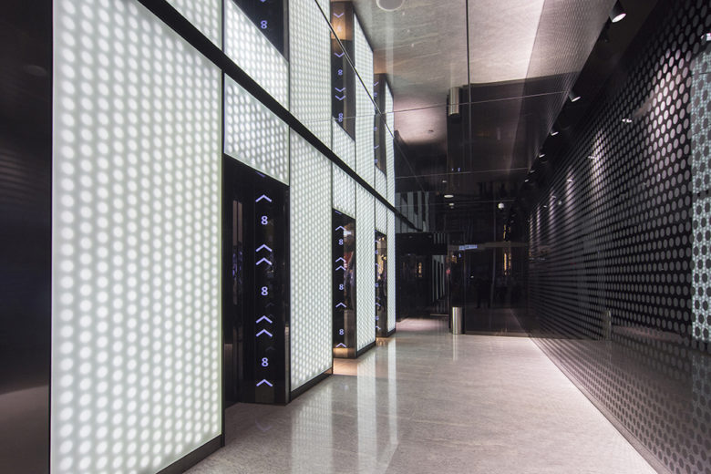 在華燈閃耀、高端品牌店和金融大廈爭相斗艷的香港中環,又誕生了一座高135m的商廈。利用建築外立面齊整的特?,用心地處理點、線、帶的關係,形成柔緩且連續的漸變面,使建築成為一個奪目的立方體;綻放著純粹、無暇的美,鶴立在周邊混雜的建築群中。玻璃上印有白色點?圖案,?層建築窗框中有3段線性照明,不僅為室?提供優美的光線,還具有外觀照明的功能。夜?正點時分,整個建築如同披上一層薄紗,上演帶有女性柔美氣質的燈光動畫秀,吸引過往路人駐足觀賞。