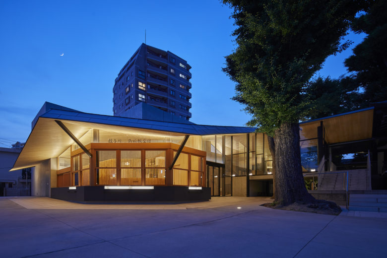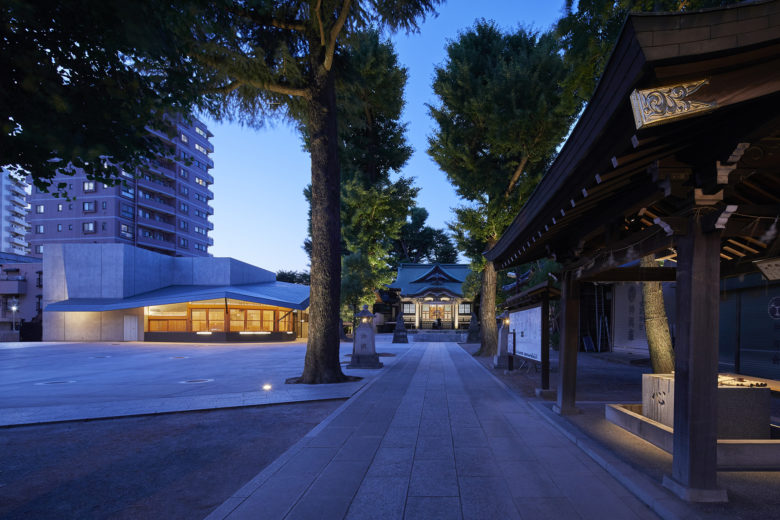 東京の下町に佇む740年の歴史を持つ神社の建替計画。新たに計画された大広場に隣接する2つの建物は、それ自体が大きな灯篭となり、その優しい光が人々を広場へ引き込む効果を生み出す。現代的でありながら和的な趣も残す建物の折半屋根は美しく光を帯び、広場に立つとその光に包まれたような感覚に陥る。神社らしい畏敬の場の雰囲気を残しながらも、地域の人にも親しみやすい光の在り方をデザインした。これまで単なる神事の場として街に閉鎖的であった神社が、季節のお祭りの時期だけでなく、地域に愛され日常的に人で賑わう憩いの場に生まれ変わった。