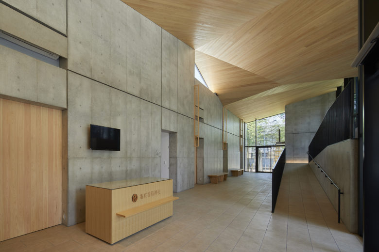 Light spills from two new buildings at a 740-year-old shrine in Tokyo's Kameari neighborhood welcoming passersby into its square. Beautiful lighting suffuses the modern, yet undeniably Japanese, folded-plate roofs. Standing in the square one feels enveloped in its radiance. The lighting design enhances the shrine's approachability while maintaining its reverent ambiance. The shrine had long been regarded not as a place for fellowship, but merely as a place for religious rituals. Now it has been transformed into a fixture of daily life - a place for relaxation and refreshment - not just a place for seasonal festivals.