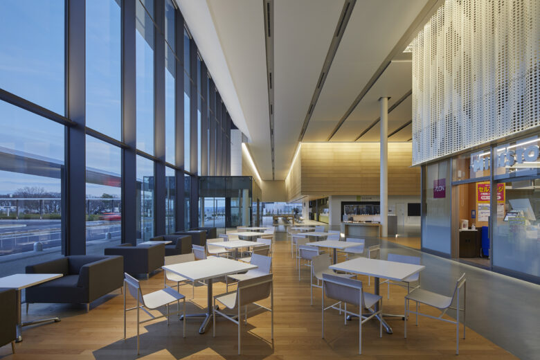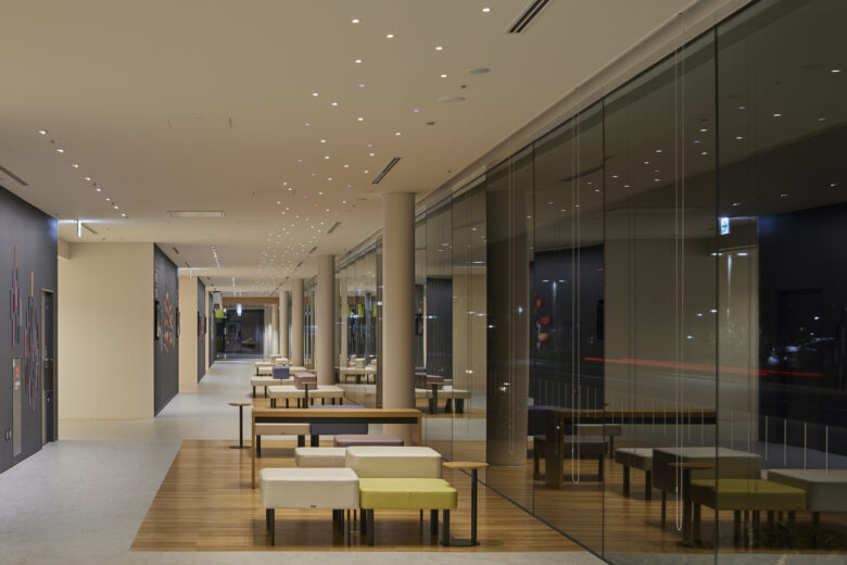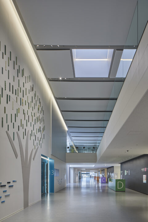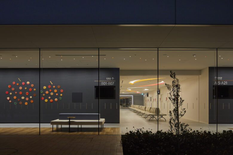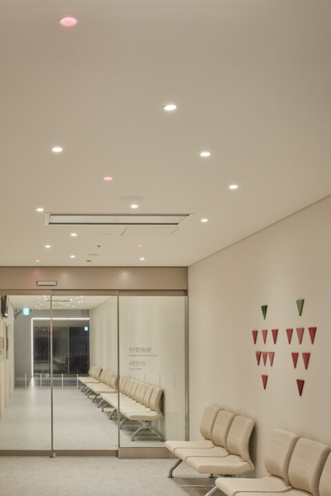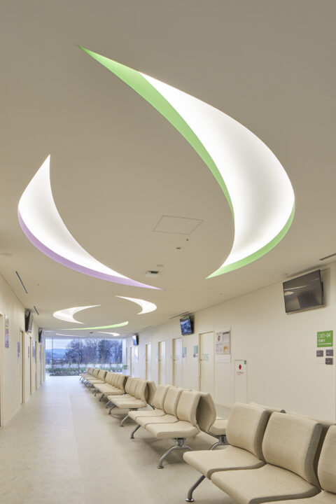 Reflecting the hospital’s managing body, a farmers’ co-op, the project was undertaken under the concept of a “Hospital Farm.” We incorporated the healthfulness that arises from farm produce into the lighting design and aimed to create a space where people can spend time with light hearts. The walls, made of natural materials like wood and soil, are lit gently with indirect lighting to create a feeling of kindness. To ensure that indirect and down lighting in the ceiling remained functional, red, yellow-green and purple hues were employed to create an association with farm produce. These lights are combined with art works that were created at workshops held at the hospital. Together these produce a bright and fun atmosphere. Each color is associated with a sign post to function in the role of guide. Thus, the architecture, signage, and lighting all work together as one to create a harmony of materials and color to complete a cheerful and friendly hospital that embodies the spirit of a farmers’ co-op.