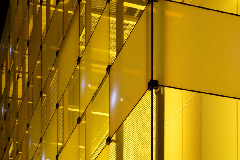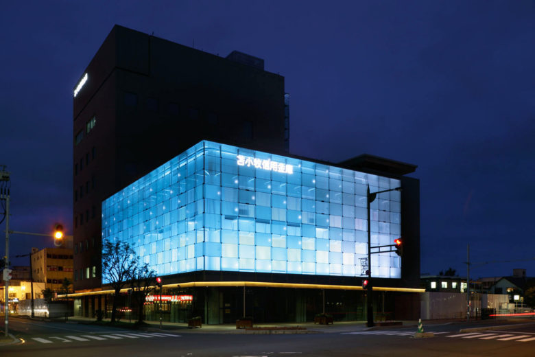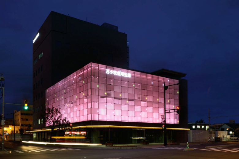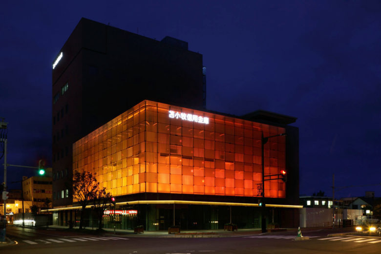 光の演出によって駅前の活性化を願うクライアントによるプロジェクト。ガラスの格子状ファサードに透過率の異なる2種類の拡散シートを選び、その貼り分け方、光らせ方を提案した。下からのアップライトで光壁全体を色付けし、シート越しに輝度光を設置。この2つの要素の組み合わせによる光の色や動きの変化によって、北海道の12 の月が表現されている。