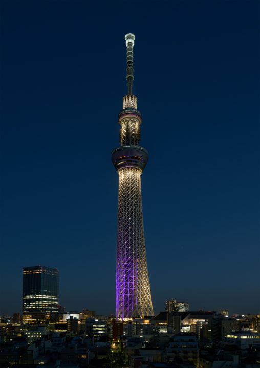 高達634米的東京晴空塔是世界上最高的自我支?及照明建築。在建築外觀和觀景台的照明設計中,以東京的審美觀念設計了兩個主題:“精華”和“雅緻”,兩個主題會在夜?交替出現。我們致力於使功耗最小化的日式風格的設計,使用“華色”:藍色和紫色,運用日本傳統光與陰影的藝術。在這個項目中,所有的光源都採用LED, 在移動中更靈活和持久。這種照明表現在日本一直都是熱門課題。