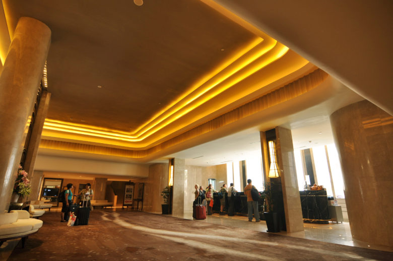 Ho Chi Minh City に古くからある老舗ホテルの改修プロジェクト。リズミカルに並ぶ行灯型ブラケットが、一流ブランドのショッピングファサードと、歴史あるホテルのエントランスにあった華やかさを作り出している。エントランスホールでは、大きな天井間接照明がゲストを迎える。
