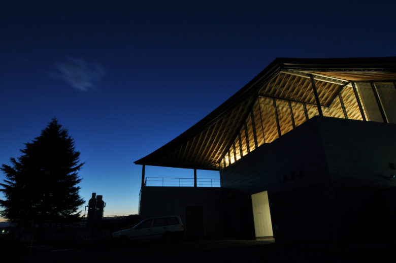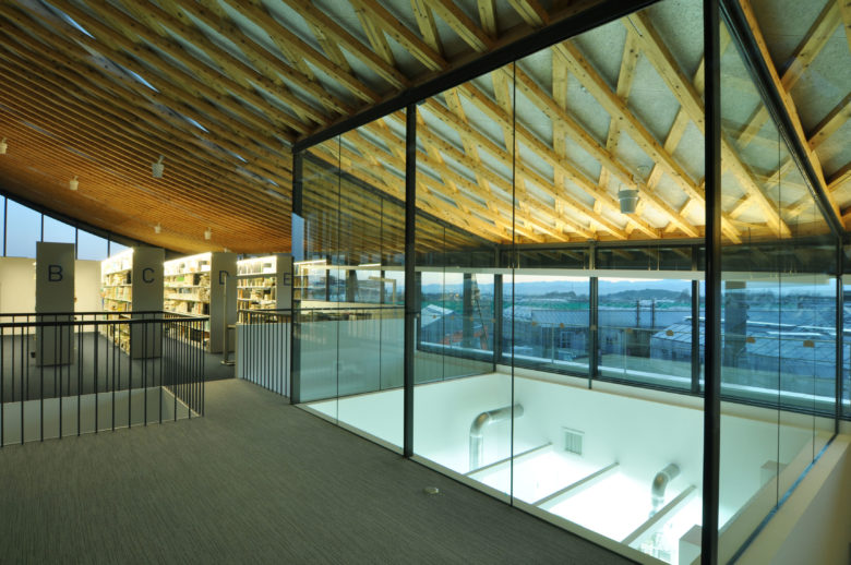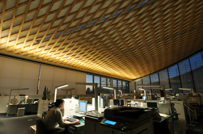 Architecture entirely covered by diagonal lattice wooden roof. The design aim here was to give both functional and aesthetically pleasing lighting. Basically, the facility is for daytime use; therefore, the general lighting is minimized. Visual luminance is supplied from the large roof. The surface of the diagonal lattice ceiling is illuminated gracefully from the lower side. For the working area, custom-built task lightings are placed for personal use, and these made possible to create an energy-saving operations.