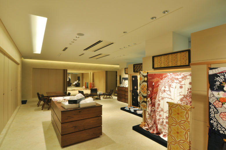 1階は着物、2階はウェディングドレスがディスプレイされている。1階では、電球色の柔らかい光によって着物の和の華やかさが感じられる場を目指した。天井の間接照明は曲線の断面形状とし、ディスプレイされた着物を見せる以外に、空間を優しい印象にすることを考えた。2階は、清潔感のあるウェディングドレスの純白や鮮やかなカラーが映えるように、色温度の高い白色の光を使用している。ガラスケースの上部を光天井とし、空から自然光が降り注いでいるようなイメージでまとめた。