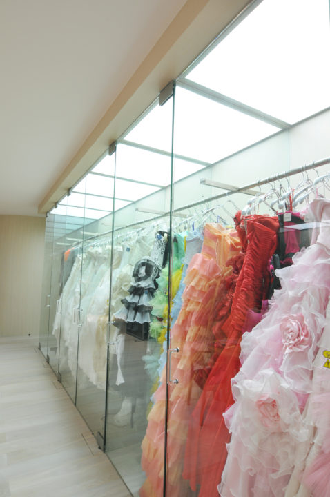 Kimonos are displayed on the first floor, and wedding dresses on the second floor.At the first floor, we set out to create the place where people can feel Japanese kimonos’ gorgeousness with soft warm white light. The form of indirect lighting on the ceiling has a curved cross-sectional shape not only to show the kimonos, but also to provide the space a soft impression. At the second floor, we designed with natural white light at high color temperature, to show the wedding dresses’ pure white and brilliant colors. Light box were integrated on the ceiling of glass display case for the image of the natural light shining down on the dresses.