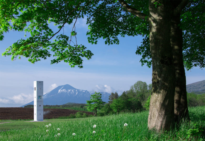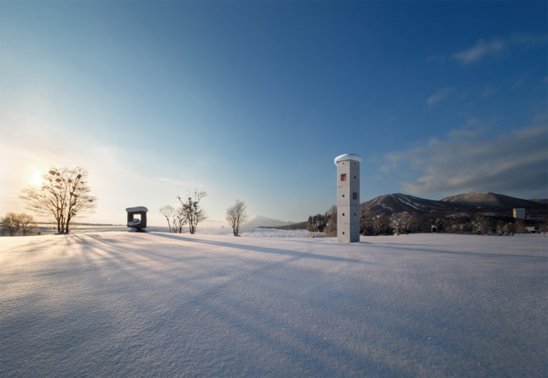 Mr. Ezoe wished to spend his twilight years in the land of Appi. Th is project was designed by his daughter Takane to fulfill this wish by installing a monument stone. Th e six meter tall monument has four open windows, in each of which shines a light representing the Appi logo. Th e spectacle is drawn in fantastically to the lights of the monument floating in the stark darkness of night. Whatever the light falls upon will change to mist in summer and to crystal in winter. Visitors can enjoy two kinds of lighting effects in a single year. Also, in order to perceive the same color of light throughout the year, the light color is delicately controlled according to season and time of a day.