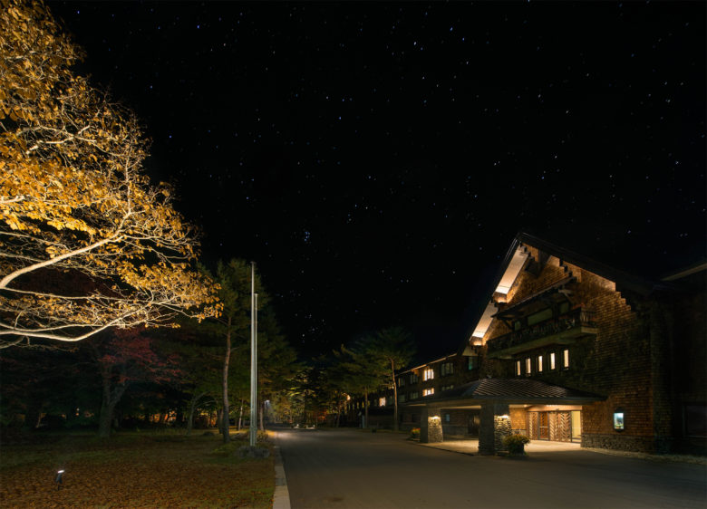 2011年、2014年と二期に渡る外観・外構の照明計画。2011年は建物の外観照明とホテルに隣接する弥六沼まわりの歩行照明を設置。特に特徴的な三角屋根をアップライトすることにより、エントランスらしい雰囲気を与えている。2014年には、磐梯山、弥六沼、及び高原を望む遊歩道を中心に照明を一新。昼だけでなく夜においても外構全体を安全に散策できるようになった。既存のポール灯や設備を再利用し、照明の存在感を抑えながら裏磐梯の木々の色が四季折々に現れるように工夫している。