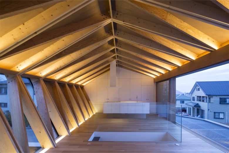 This two-story house stands on a small rise of land and overlooks Matsuyama city from the second floor. The design of the house varies significantly by floor: the first floor design is simple and functional while the second floor is overlaid with triangle shaped laminated wood. Various patterns were drawn up in CG in order to come up with a lighting method to illuminate the wooden beams beautifully and enfold the house in gentle light. Despite each floor employing a different lighting design, the lighting of the house was designed with unified lighting effects to exhibit the beauty of shadowing.