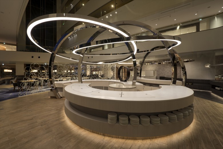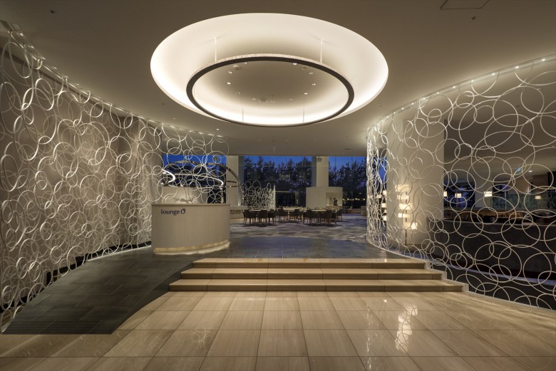 Lounge O is a lounge located at the center of the hotel lobby. The interior design uses many circles, each element of which is highlighted by wash downlighting and indirect lighting to draw guests into the lounge. Within the eleven-story atrium are two large ring lights floating above the buffet counter. These exist are artistic pieces as well as provide functional brightness.