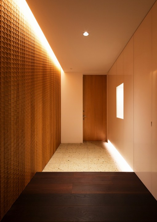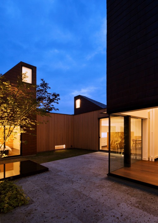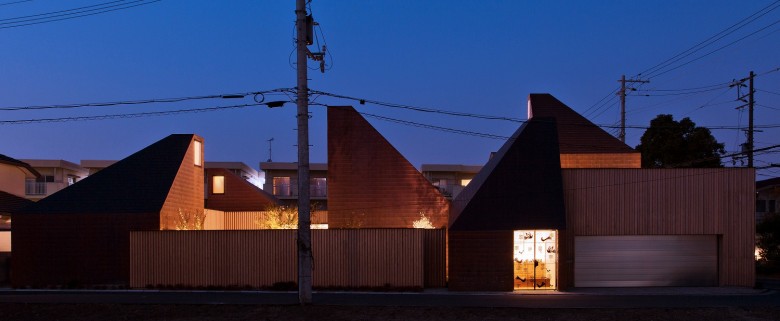 閑静な住宅街に佇む複数の勾配の大きな三角屋根が群をなす戸建住宅。三角屋根の内部はリビングや寝室などの主要な部屋が割り当てられ、頂部には外光を取り入れるハイサイドライトが設けられている。夜間においても、昼間と同様に如何に柔らかい光で満たすかが主題となった。リビングでは頂部にハイサイドライトと同じ大きさの光天井を計画し、光量のある柔らかな光が居心地のよい空間を作り出している。エントランスやダイニングでは間接照明とアクセントとして加えられたミニマルなダウンライトの組み合わせにより、住宅に最適な優しいコントラストをつくり出している。