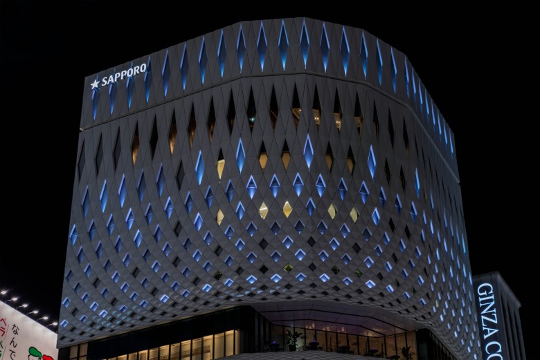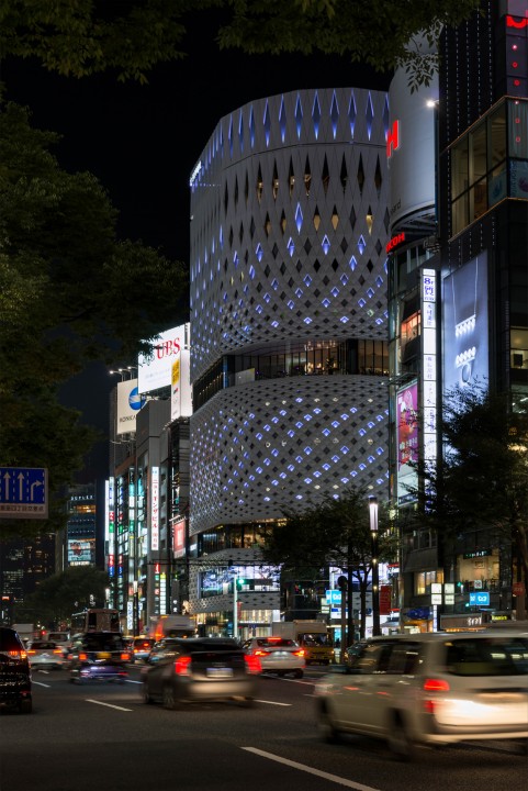 外牆的空隙部分採用了LED燈去加強鏤空的部分。運用枝編鏤空設計目的是製造美麗的外觀和營造一種立體和具深度視覺效果。鏤空部?採用了RGB LED燈去控制它的顏色和光度。我們的設計動機是製造一個玩味的燈光照明,從而提供一個全新的、與銀座周圍環境協調的氣氛。