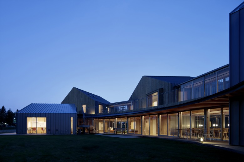 外観照明は、木素材で仕上げられた家形の妻面のエッジを柔らかくライトアップすることで、建築の重なりを美しく感じられる風景となるようにした。