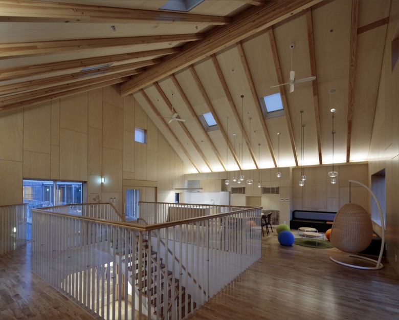 各部屋では、様々な勾配のついた木天井を大胆に照らし上げる間接照明により十分な明るさを確保し、ダウンライトなどの機能照明は一切排除して住宅らしい暖かい雰囲気を作り出した。