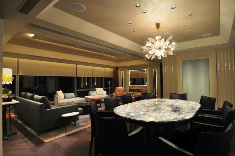 香港島の南エリアに位置し、海に面して建つレジデンシャルビル”Larvotto”内の住宅プロジェクト。四角形をテーマにしているインテリアデザインは、すべての箇所に渡って繊細なディテールが施されており、照明計画についても同様に高度で緻密な納まりで応えている。ハイライトと間接光のバランスが非常によく保たれており、もてなしとくつろぎを感じさせる空間に仕上がっている。