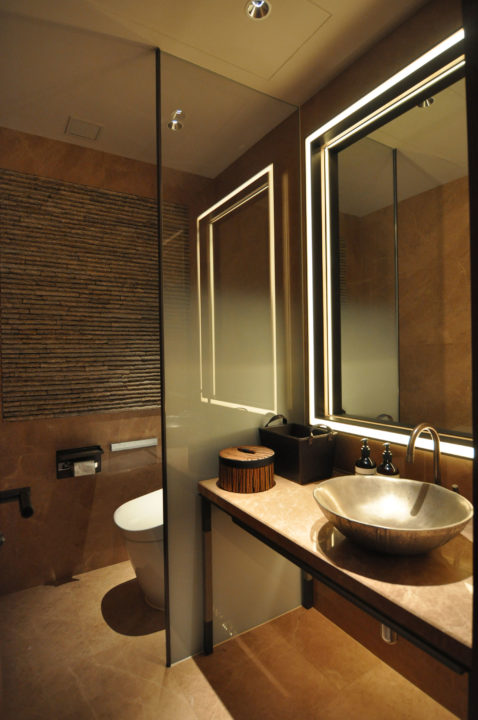 Th is was a residential project for the Larvotto building that faces the ocean. It is located in the southern area of Hong Kong Island. Th e ceilings and walls and even the fi xtures and mirrors are so delicately detailed that elaborate, high-level design skills were required in he selection of lighting equipment and fi ttings. Th e balance of highlighting and indirect lighting is extremely well kept to provide the space with the prestigious character of hospitality and relaxation.