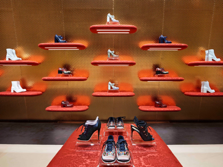 東京・青山のみゆき通りに建つ、箱の側面が開いたような建築。凹凸の黒い梁の間に仕込まれた照明により、色彩豊かな商品や曲面で構成されたダマスク柄の壁を照らし出す。室内の什器にも細かく光を計画し、商品を美しく見せることに徹している。この箱の開いた面の内側はテクスチャーのある真鍮素材で仕上げられており、上方より美しく輝かせることで素材感を引き立てている。