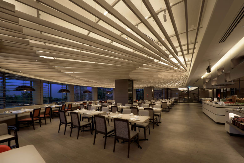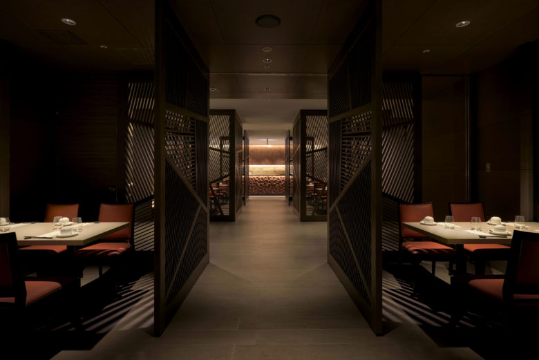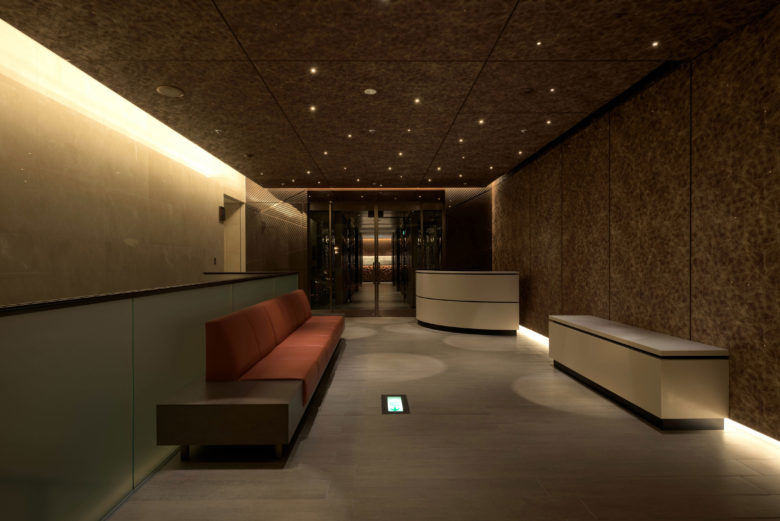 A pattern of light is projected on the floor of the restaurant entrance by casting clear lights with pin spot lights through 20mm-diameter holes.In the family area, the main space of the restaurant, two lighting solutions were employed. Indirect lighting was used for the large area of the ceiling and spot lighting was carefully hidden between louvers. The combination of the two solutions changes the impression of the space every hour.